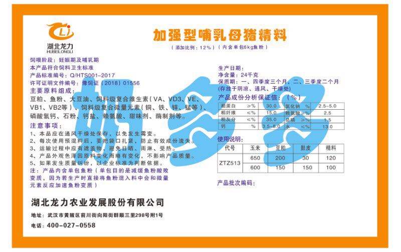 湖北龍力農(nóng)業(yè)發(fā)展股份有限公司坐落于武漢市黃陂區(qū)前川街向陽(yáng)街群順三里298號(hào)附1號(hào)。公司成立于2014年6月,公司自成立以來(lái)把“創(chuàng)全球最大養(yǎng)豬綜合服務(wù)”為企業(yè)愿景。致力于打造教保料品牌”作為公司發(fā)展的明確目標(biāo)。公司一直致力于豬營(yíng)養(yǎng)的研究和開(kāi)發(fā),積極與國(guó)內(nèi)外高校和科研機(jī)構(gòu)合作,推廣養(yǎng)豬技術(shù)、動(dòng)物營(yíng)養(yǎng)新概念,向世界農(nóng)牧企業(yè)學(xué)習(xí)與合作。公司采用國(guó)內(nèi)先進(jìn)的生產(chǎn)工藝,選擇高精度電子配料秤,高均勻度、無(wú)殘留混合機(jī)等先進(jìn)設(shè)備....